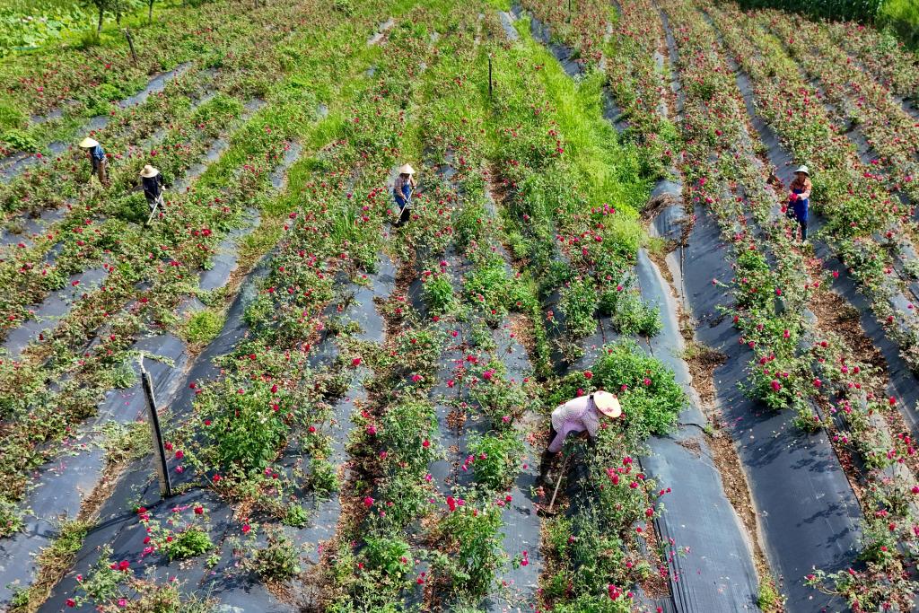 7月16日,产业工人在位于丘北县八道哨乡的玫瑰种植基地劳作。