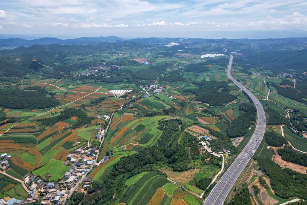 ↑2025年7月19日在云南省曲靖市马龙区月望乡拍摄的万寿菊花田。(无人机照片)CICPHOTO/杨俊鹏 摄