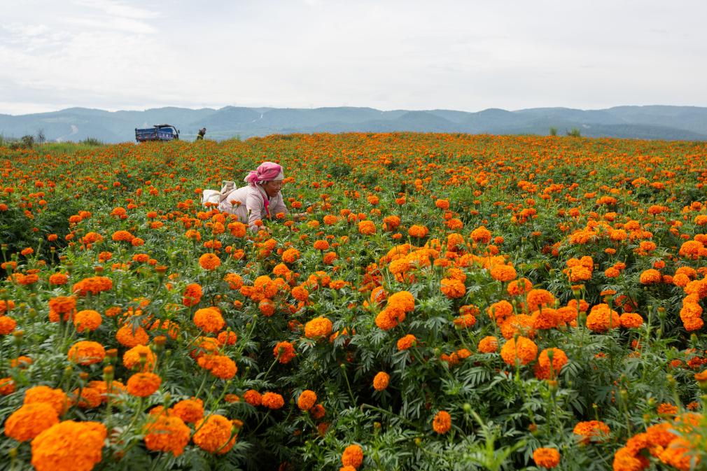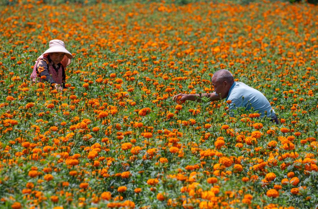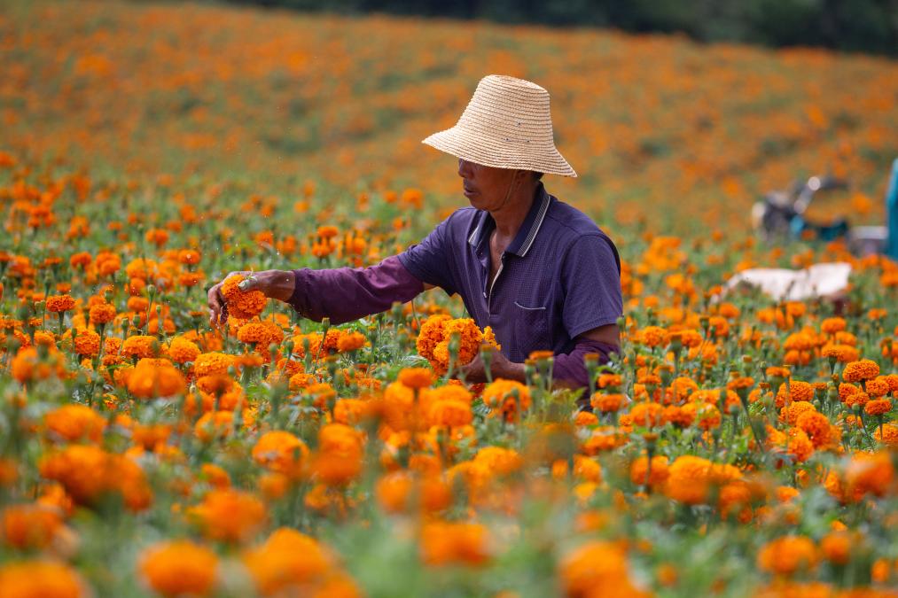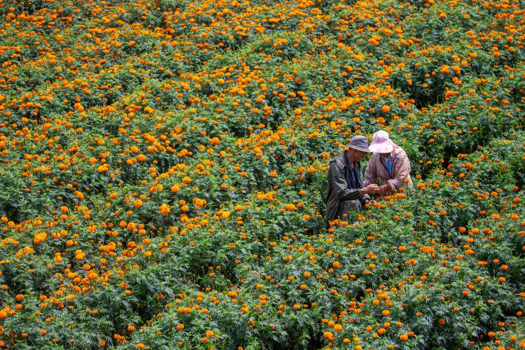 ↑2025年7月19日,在云南省曲靖市马龙区月望乡,花农在采摘万寿菊。CICPHOTO/杨俊鹏 摄 编辑:武兴