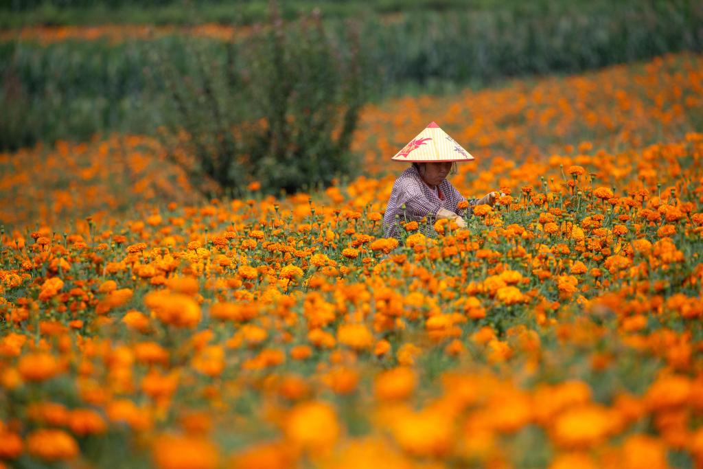 ↑2025年7月19日,在云南省曲靖市马龙区月望乡,花农在采摘万寿菊。CICPHOTO/杨俊鹏 摄