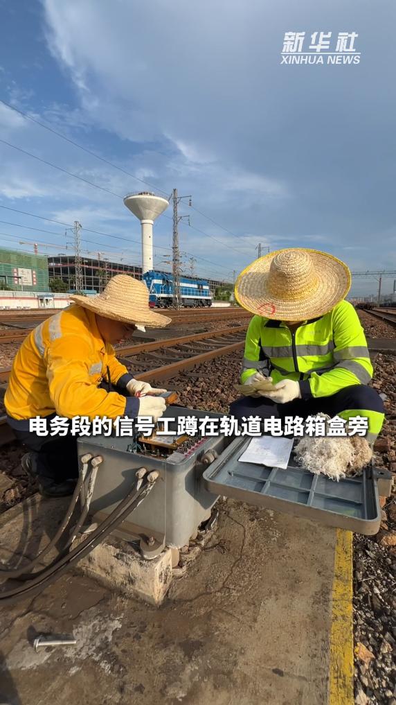 在位于广东深圳的平湖南货运站里,铁路人员在高温下坚守岗位。