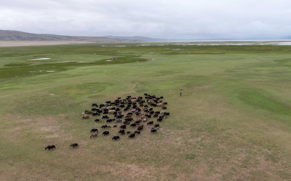 7月22日拍摄的玛旁雍错湿地上的牦牛(无人机照片)。