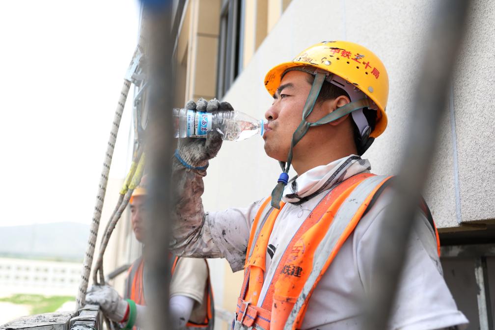 7月23日,在甘肃省武威市古浪县的中铁二十局一处项目工地上,一名施工人员在工作间隙补充水分。