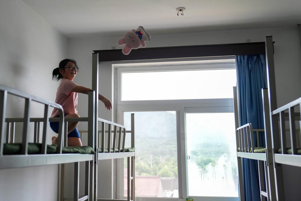 7月29日,小朋友在北京市密云区太师庄中学居民安置点内玩耍。