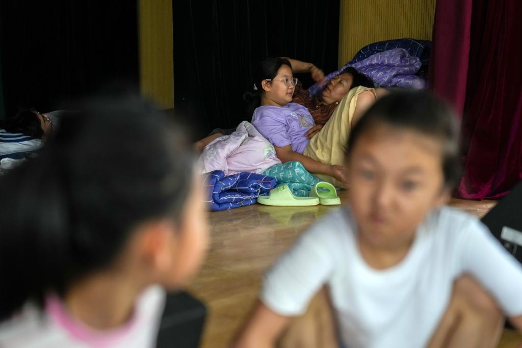 7月29日,在北京市密云区太师庄中学居民安置点,安置在此的小朋友和家人在休息。