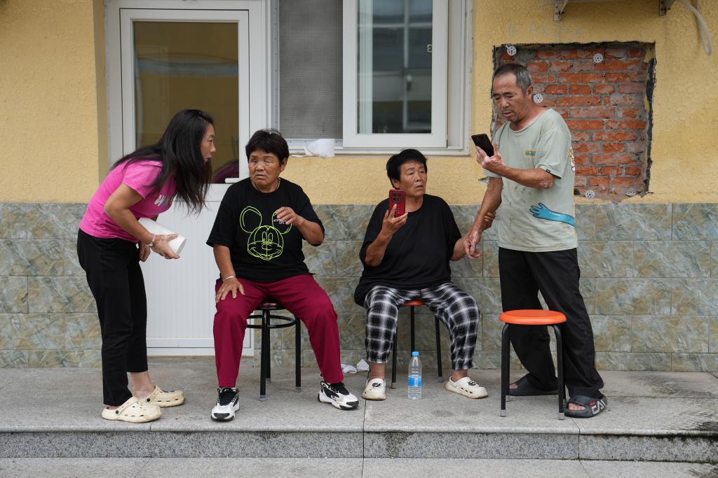 7月29日,在北京市密云区太师庄中学居民安置点,几位安置群众在交流。