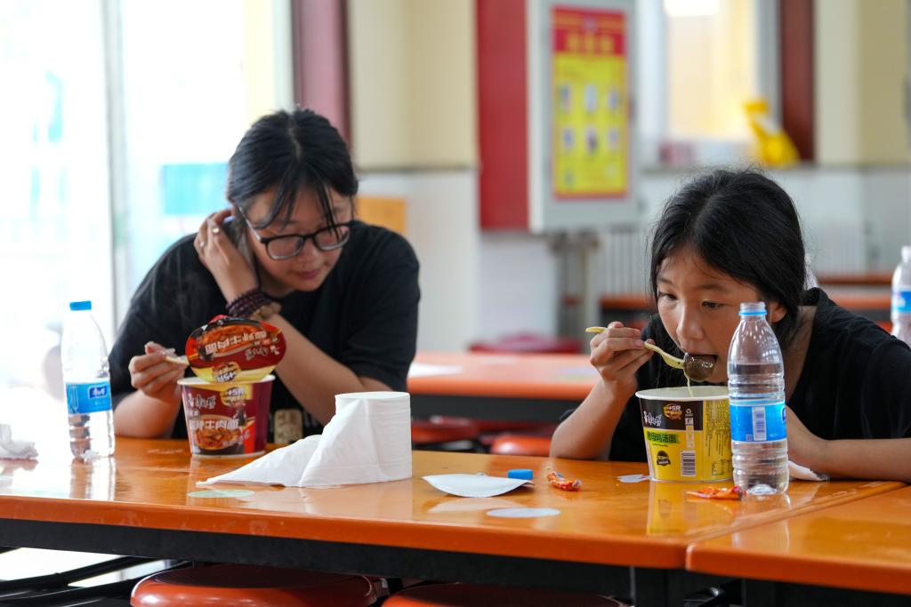 7月29日,在北京市密云区太师庄中学居民安置点,居民在吃方便面。