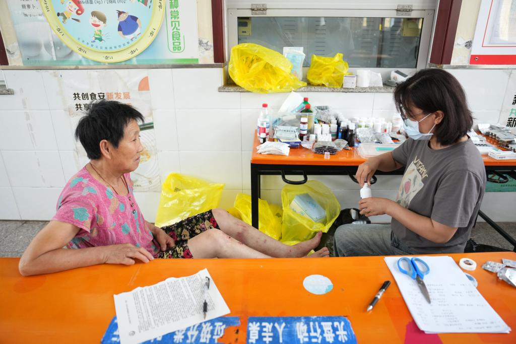 7月29日,在北京市密云区太师庄中学居民安置点,太师屯镇社区卫生服务中心的医生(右)为居民处理伤口。