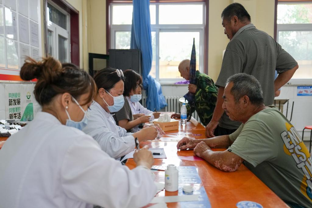 7月29日,在北京市密云区太师庄中学居民安置点,太师屯镇社区卫生服务中心的医生为安置在此的群众开药。