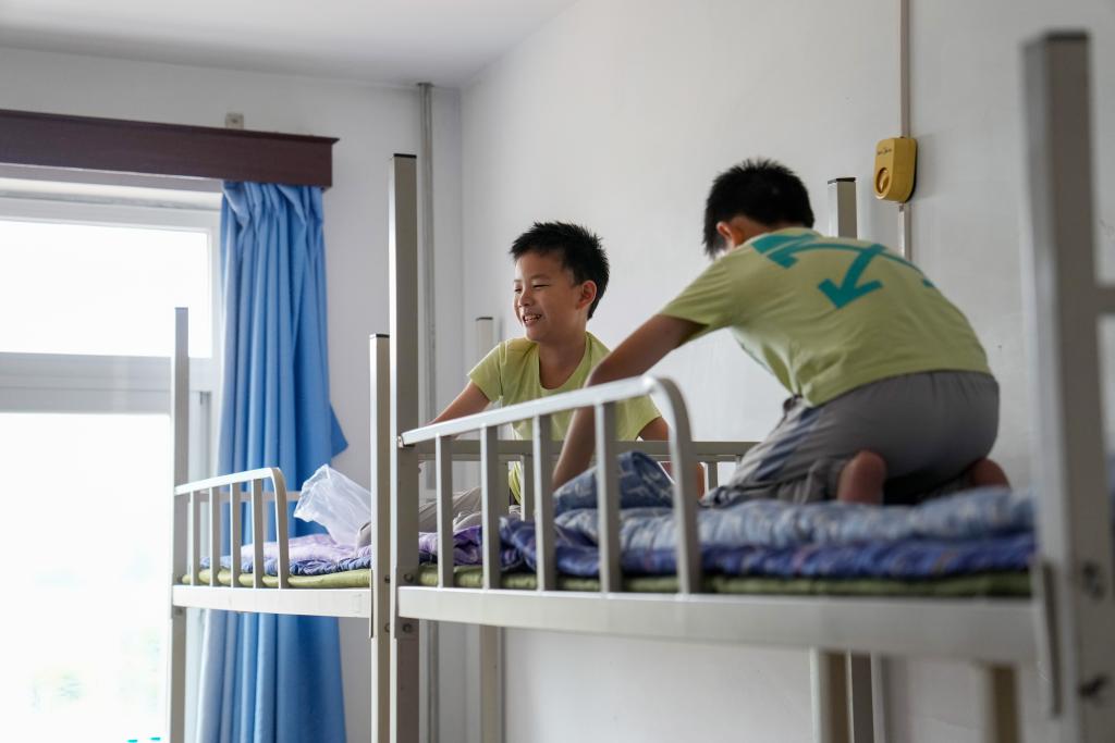 7月29日,两名小朋友在北京市密云区太师庄中学居民安置点内玩耍。