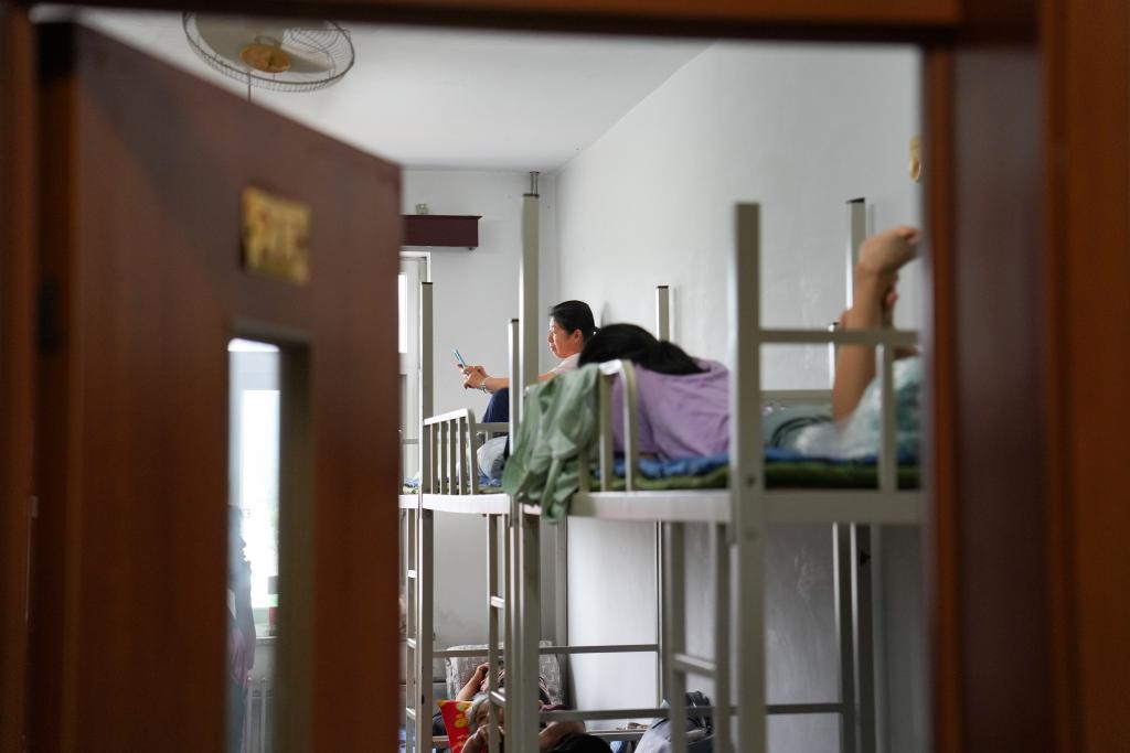 7月29日,在北京市密云区太师庄中学居民安置点,几位安置在此的群众在休息。