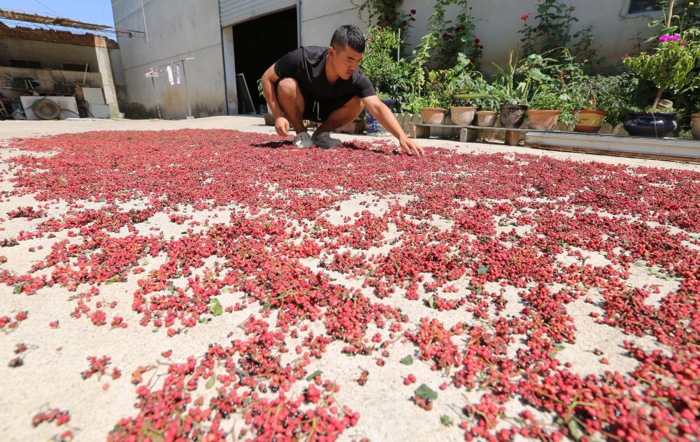盛夏时节,甘肃省天水市甘谷县的花椒进入采摘旺季,村民们趁着晴好天气采摘、晾晒、交售花椒,销往四川、重庆、山东等地。