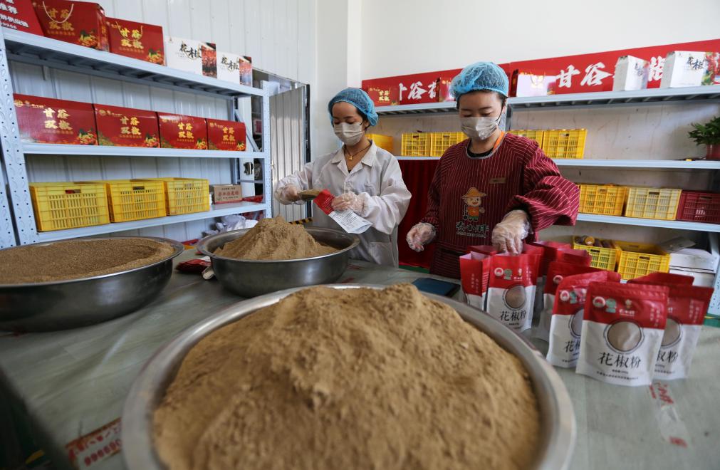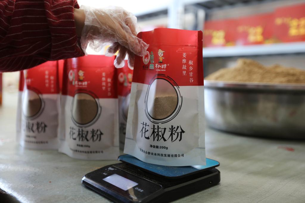 7月30日,工作人员在甘肃省天水市甘谷县甘谷花椒集散交易中心将花椒粉装袋。