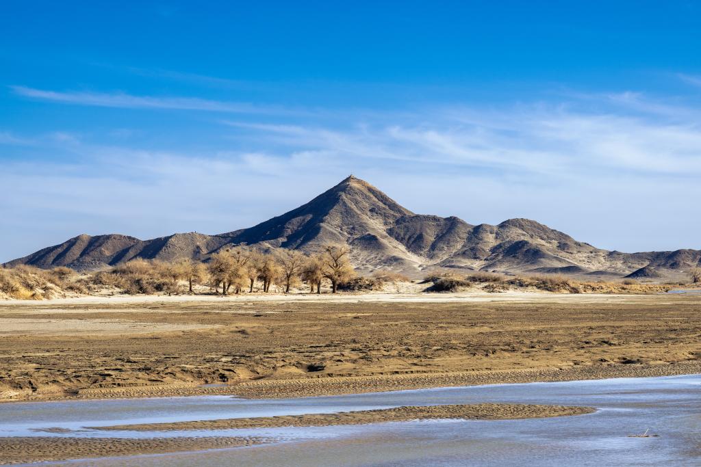 2025年4月22日在内蒙古阿拉善盟额济纳旗拍摄的弱水河与狼心山风光。