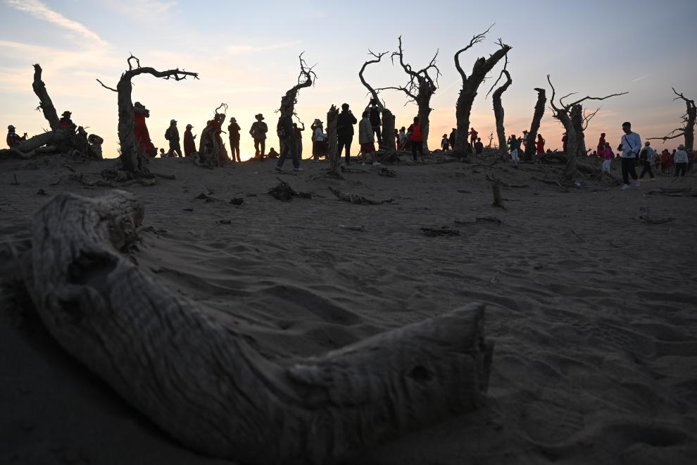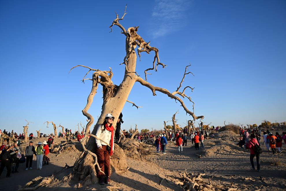2024年10月14日,游客在内蒙古阿拉善盟额济纳旗怪树林景区游玩。