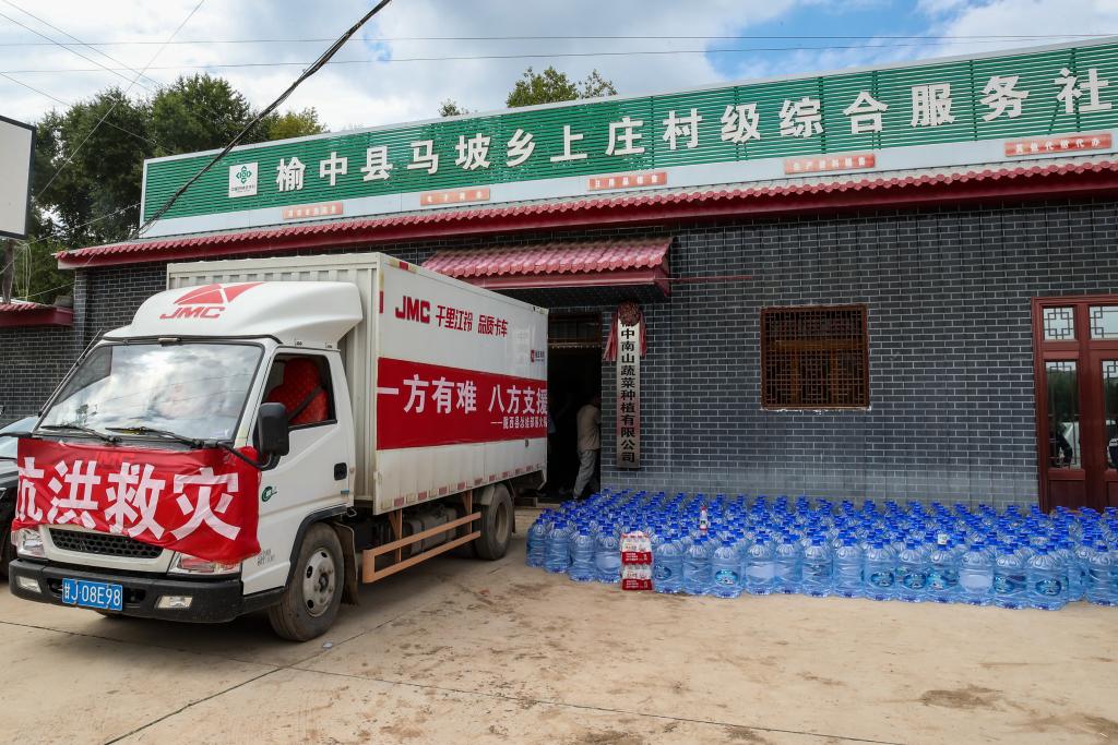 8月10日,一辆载着救援物资的车辆停靠在榆中县马坡乡上庄村临时安置点。