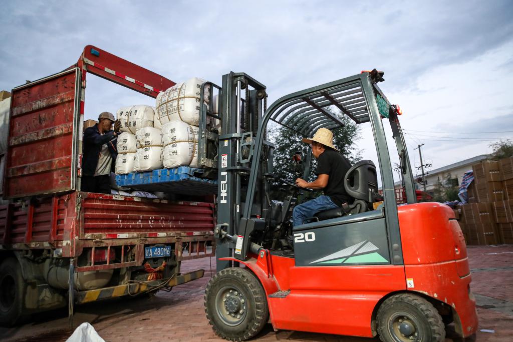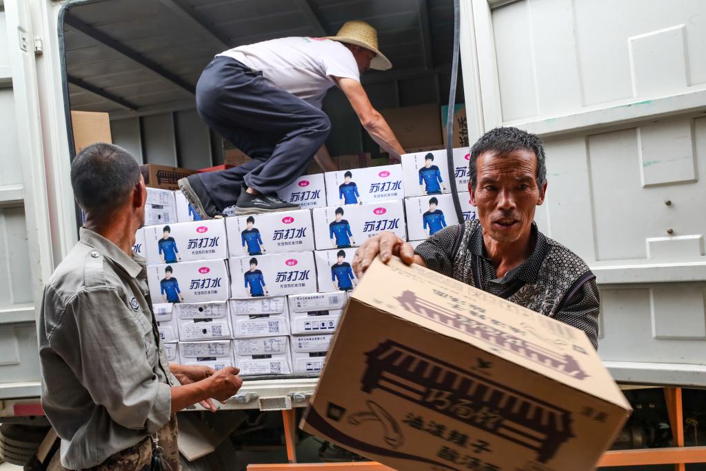 8月10日,在榆中县救灾物资储备服务中心,工作人员将救灾物资装车。