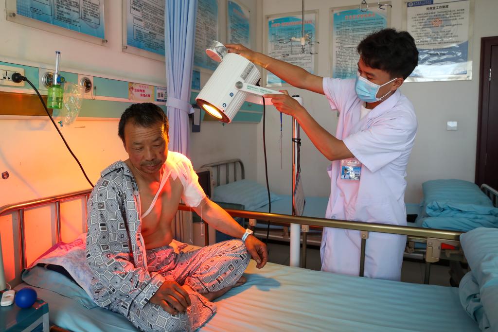 8月11日,在榆中县第一人民医院,医护人员为伤员的左肩进行物理因子治疗。