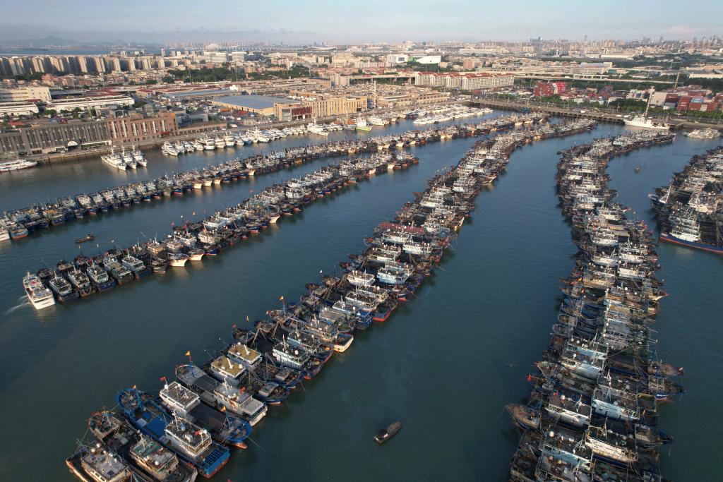 8月12日,渔船在福建厦门高崎闽台中心渔港躲避台风(无人机照片)。