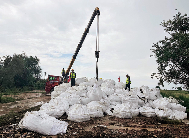 内蒙古包头市土默特右旗的抢险人员加快调运吨包等防汛物资(2025 年 8 月10 日摄) 王靖摄 / 本刊