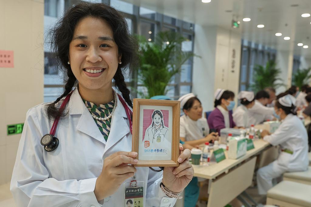 8月19日,一位参加义诊的医生在北京协和医院东单院区展示志愿者绘制的专属肖像漫画。