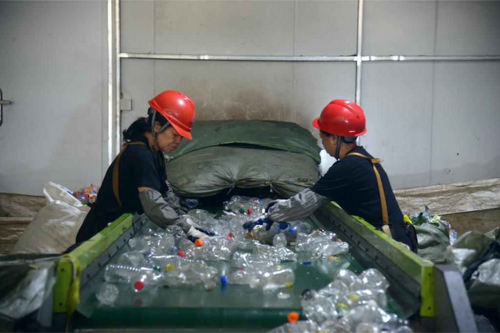 在位于福州马尾区的福州城投再生资源分拣中心,工人整理智慧光选机筛选后的可回收垃圾(9月13日摄)。