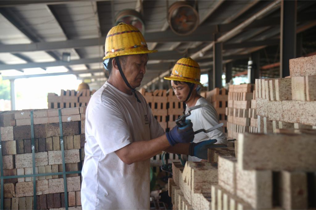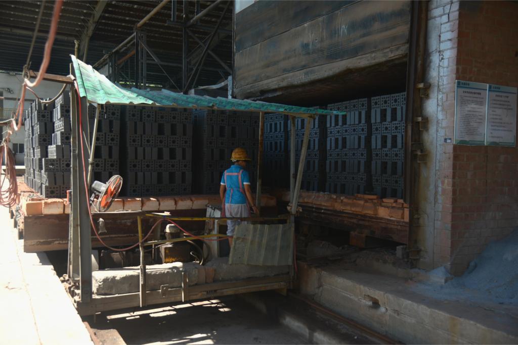在福州闽侯县一家建筑垃圾资源化利用企业的生产园区,工人将一批由建筑垃圾制作的砖坯送入焙烧设备(9月13日摄)。