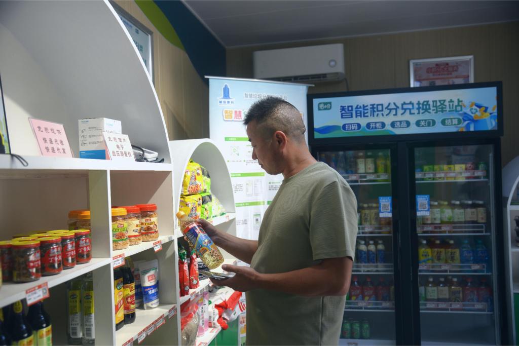 福州灰炉新苑小区居民使用通过垃圾分类获得的积分兑换商品(9月13日摄)。