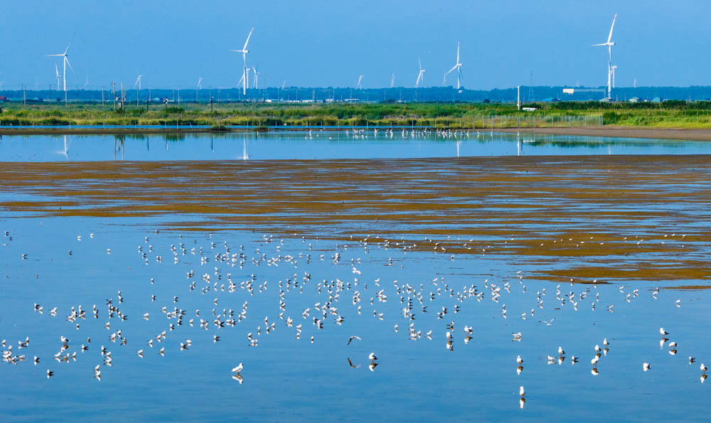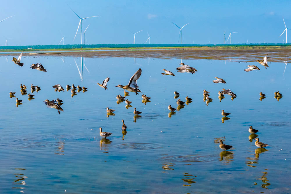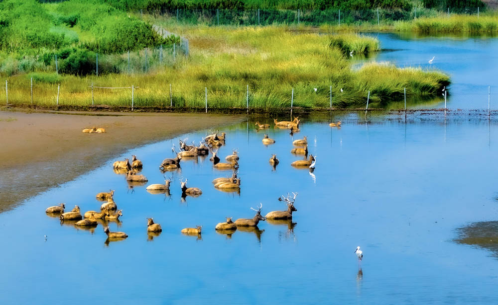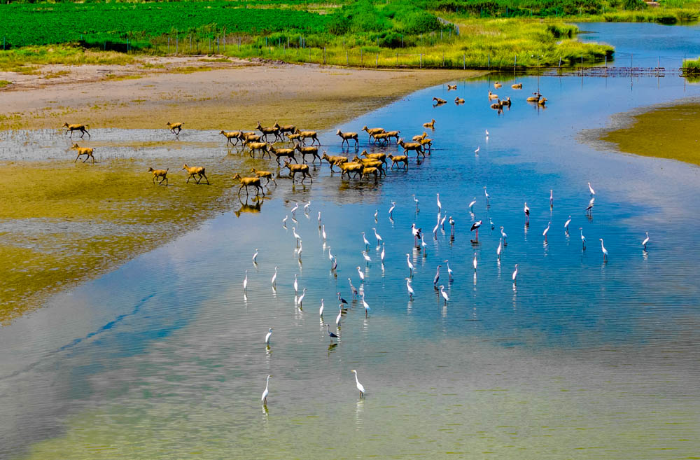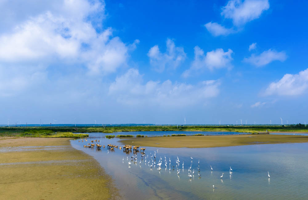 蓝天白云下,大批候鸟在江苏省东台市条子泥湿地栖息觅食,成群麋鹿在湿地嬉戏奔跑,呈现人与自然和谐共生的生态美景。