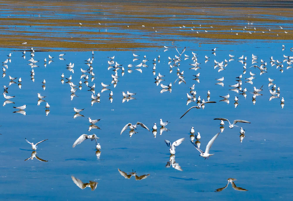 ↑2025年9月15日,江苏省东台市条子泥湿地,候鸟在湿地飞翔。(无人机照片)CICPHOTO/孙家录 摄