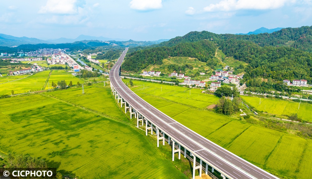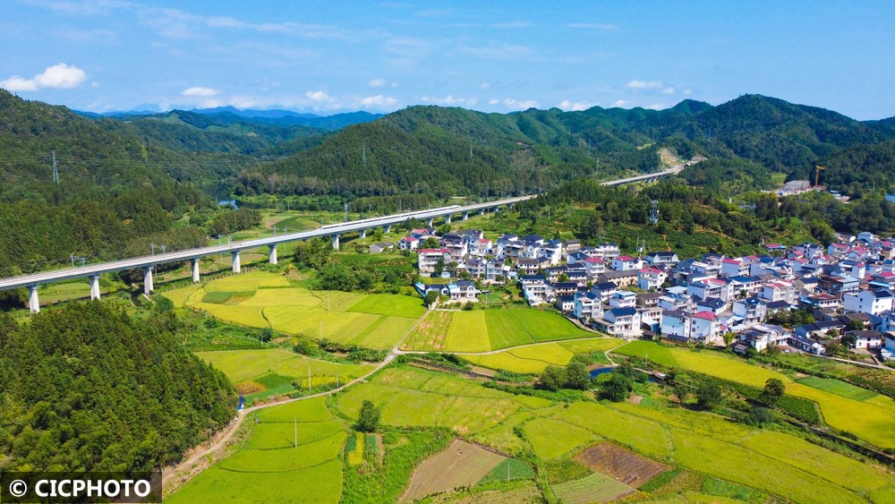 ↑2025年9月14日,一列高铁列车驶过安徽省黄山市祁门县平里镇双程村的稻田。(无人机照片)CICPHOTO/程启群 摄