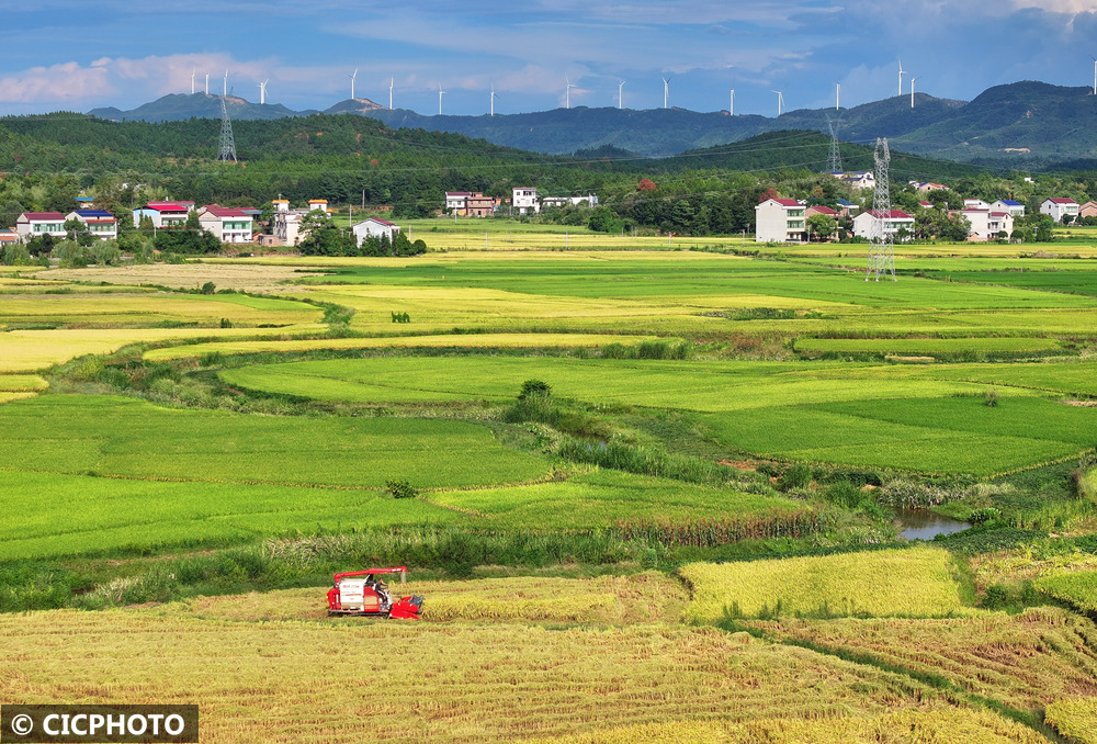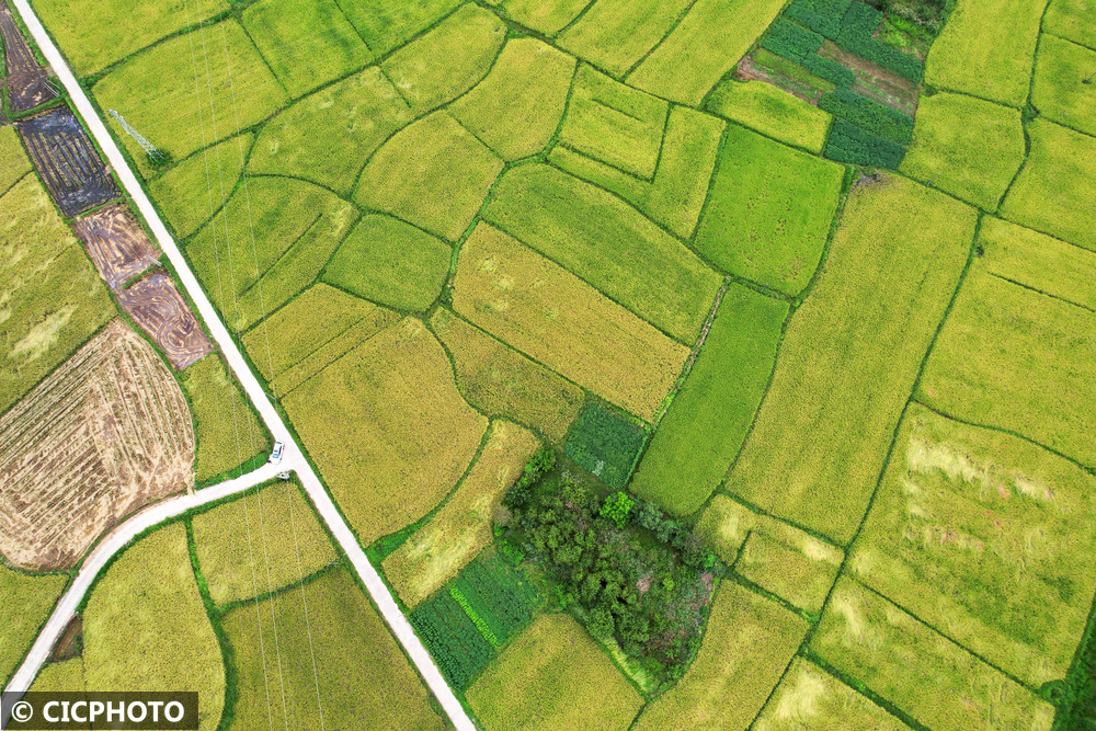 初秋时节,各地水稻陆续成熟,黄绿相间的稻田在蓝天白云映衬下呈现喜人的丰收美景。