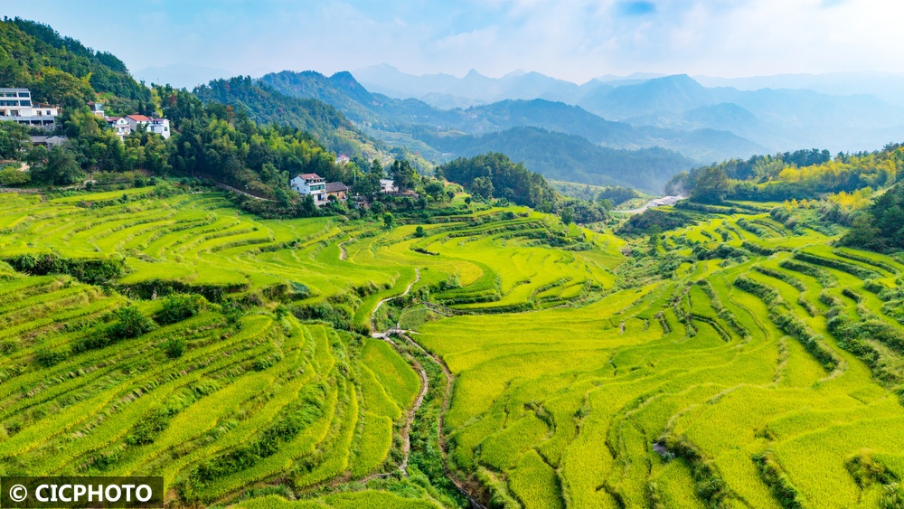 ↑2025年9月6日在安徽省安庆市岳西县温泉镇拍摄的稻田。(无人机全景照片)CICPHOTO/熊凤霞 摄