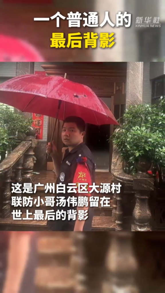 雨中街巷,他背对镜头,右手里的伞斜向左肩,头微微仰着,望向山边的一片房子。他身着一件普通的黑色治安联防制服,唯一称得上醒目的是左臂上的红袖章,上面写着“广州街坊”。