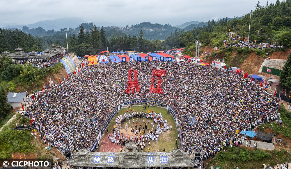 ↑2025年9月20日,人们在贵州省黔东南苗族侗族自治州从江县丙妹镇松学斗牛塘观看民俗表演。(无人机照片)CICPHOTO/罗京来 摄