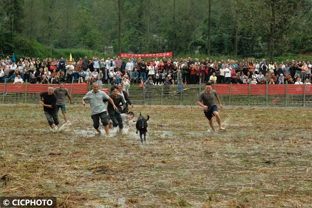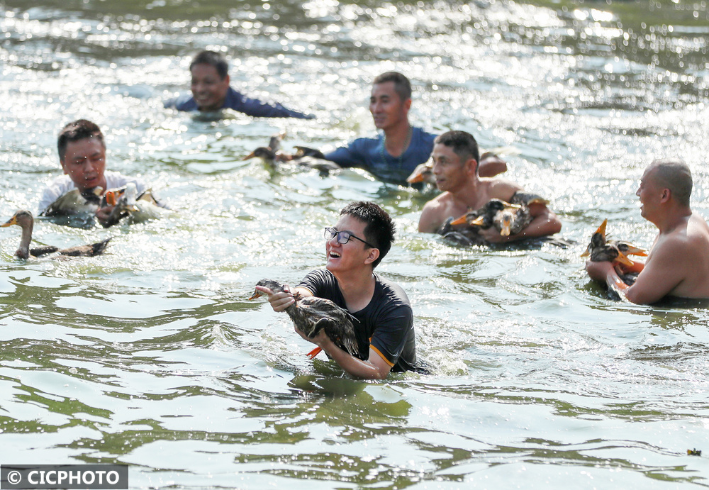 ↑2024年9月14日,四川省广安华蓥市溪口镇和重庆市合川区三汇镇的群众在溪口镇袁家坝村参加捉鸭子比赛。CICPHOTO/邱海鹰 摄