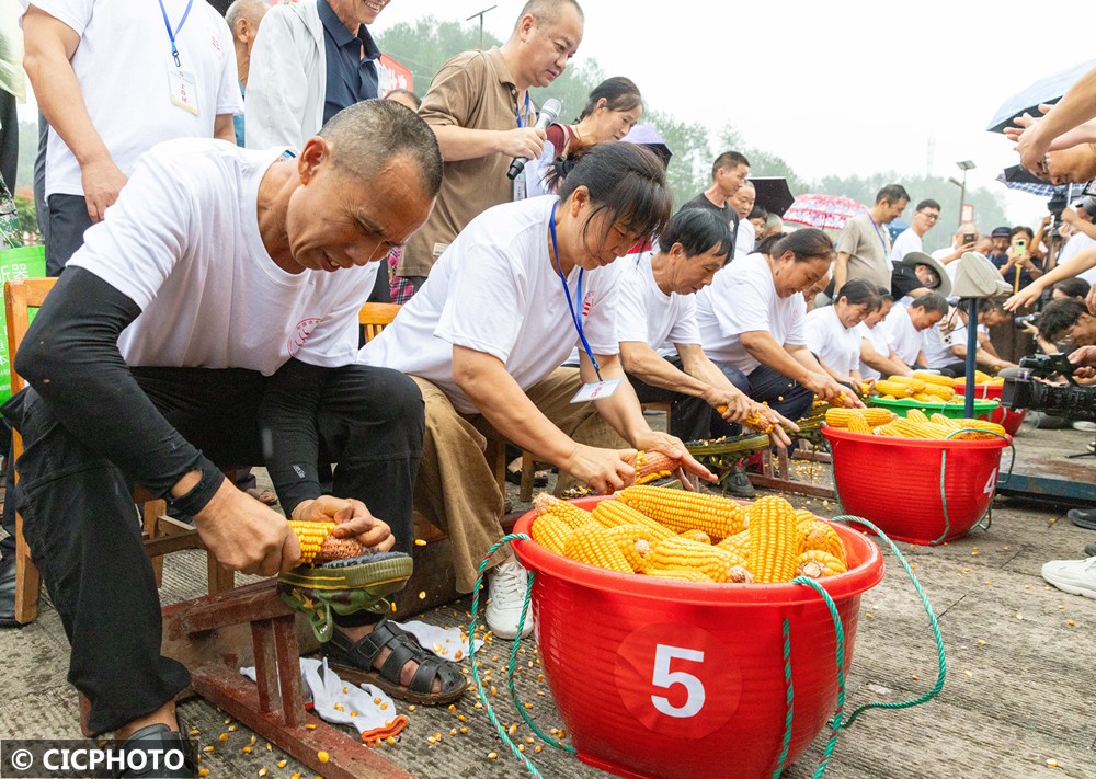↑2025年9月12日,重庆市南川区兴隆镇永福村村民在参加剥玉米比赛。CICPHOTO/罗川 摄