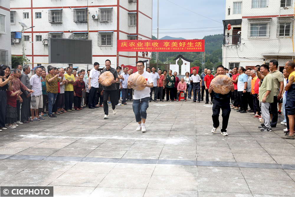 ↑2025年9月18日,人们在四川省广安市广安区花桥镇蒲莲社区文体广场参加搬运南瓜趣味比赛。CICPHOTO/廖小兵 摄