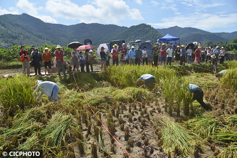 ↑2025年8月23日,游客和广西贺州市富川瑶族自治县朝东镇黄沙村村民比赛收割水稻。CICPHOTO/黄旭胡 摄
