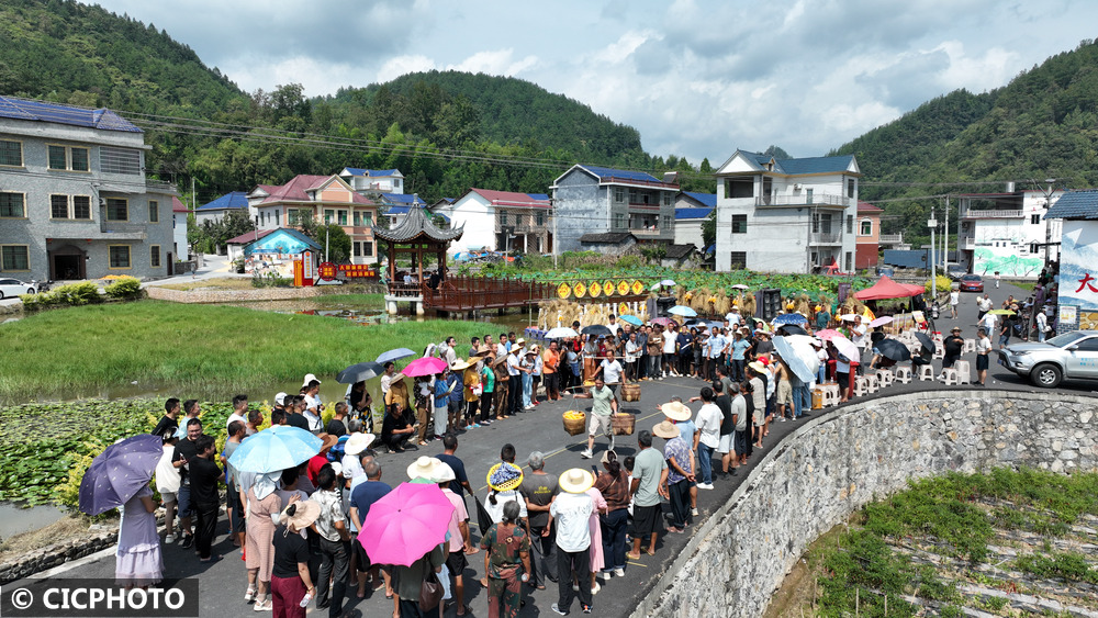 ↑2025年9月5日,重庆市秀山土家族苗族自治县洪安镇贵措社区村民在参加挑苞谷比赛。(无人机照片)CICPHOTO/胡程 摄