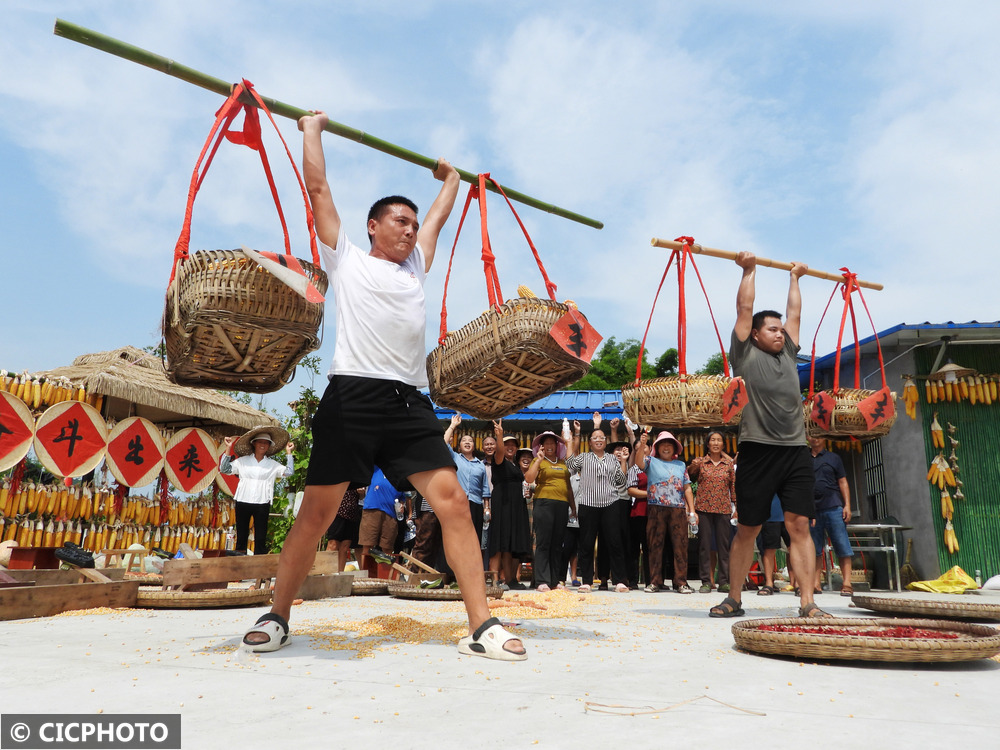 ↑2025年8月6日,四川省达州市渠县宝城镇马鞍村村民在参加20公斤玉米“举重”比赛。CICPHOTO/邓良奎 摄