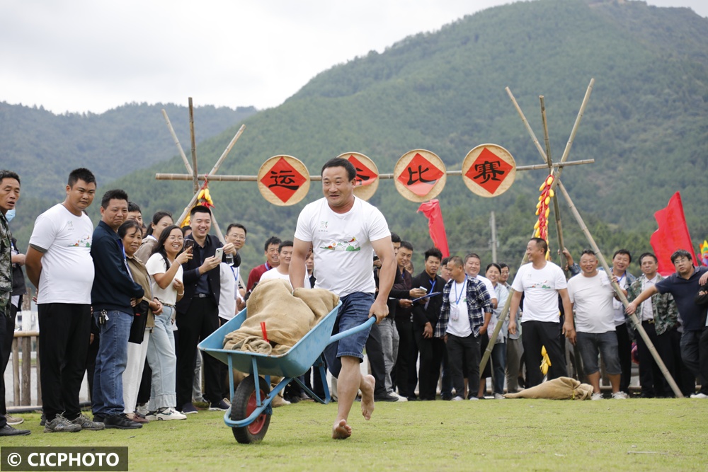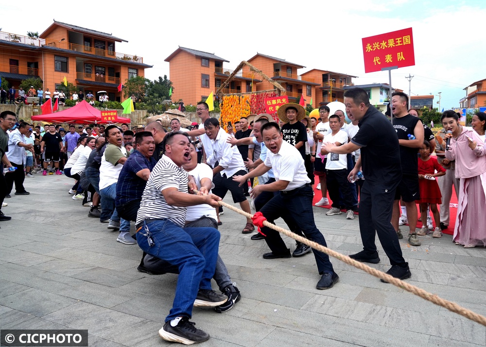 ↑2024年9月28日,参加云南省昭通市永善县农民运动会的选手在该县永兴街道明子村比赛拔河。CICPHOTO/陈洪 摄