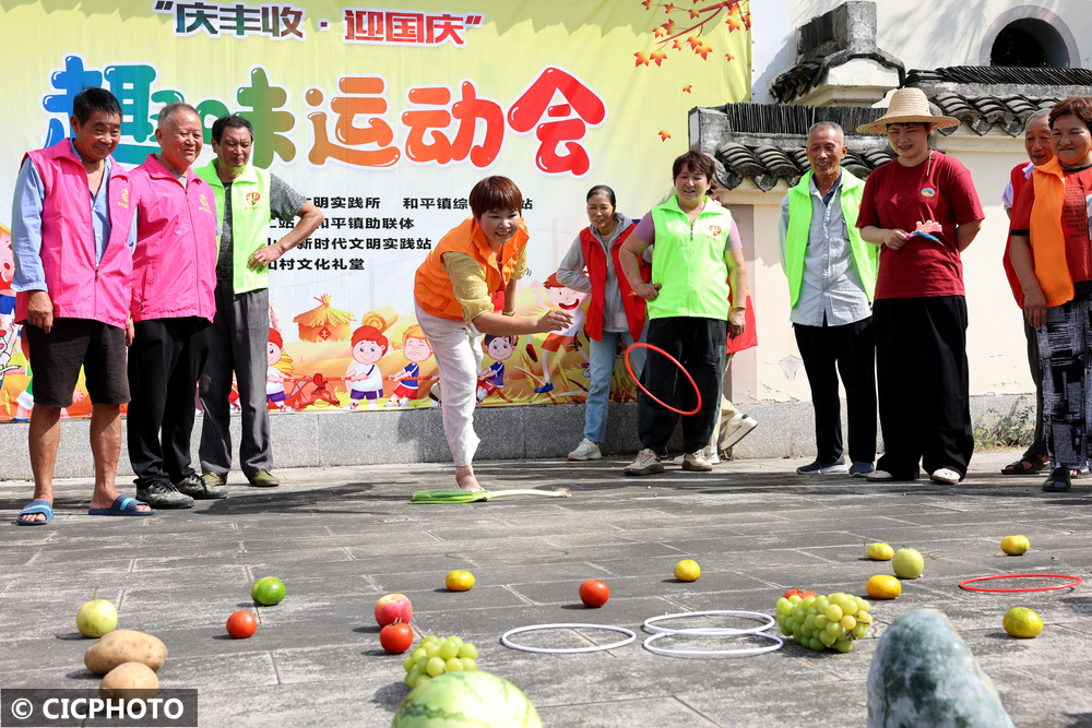 ↑2024年9月29日,浙江省湖州市长兴县和平镇横山村村民在进行蔬果套圈比赛。CICPHOTO/吴拯 摄