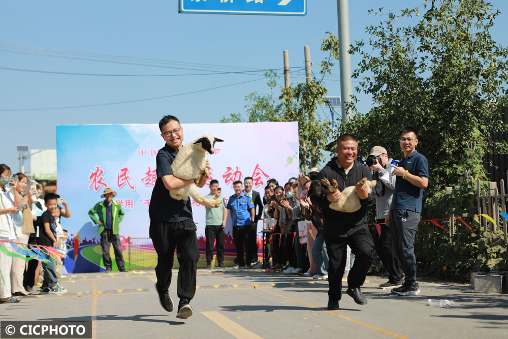 ↑2024年9月22日,河北省邯郸市邯山区南堡乡农民在参加“抱羊跑”比赛。CICPHOTO/李昊 摄