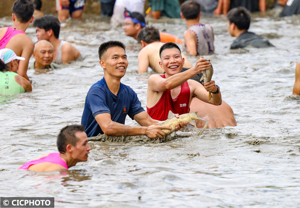 ↑2024年9月8日,游客和贵州省铜仁市玉屏侗族自治县亚鱼乡郭家湾村村民在参加摸鱼比赛。CICPHOTO/胡攀学 摄 编辑:马兰