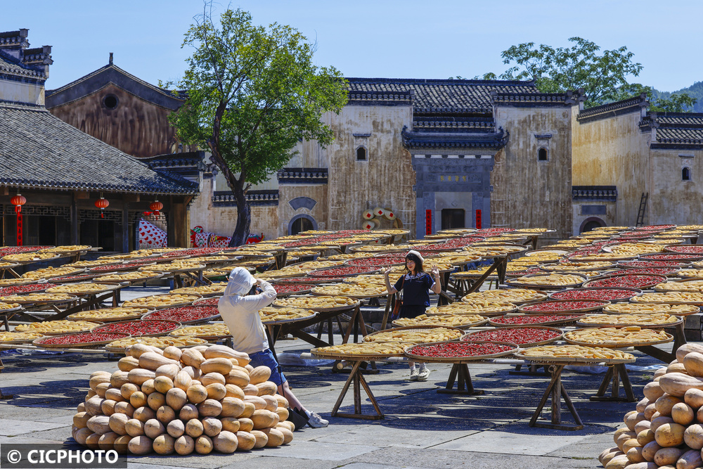 ↑2025年8月18日,游客在安徽省黄山市徽州区呈坎村晒场上赏景拍照。CICPHOTO/施亚磊 摄