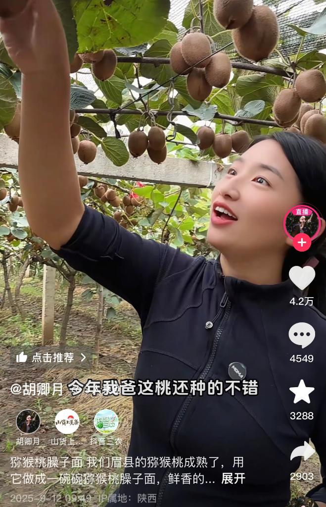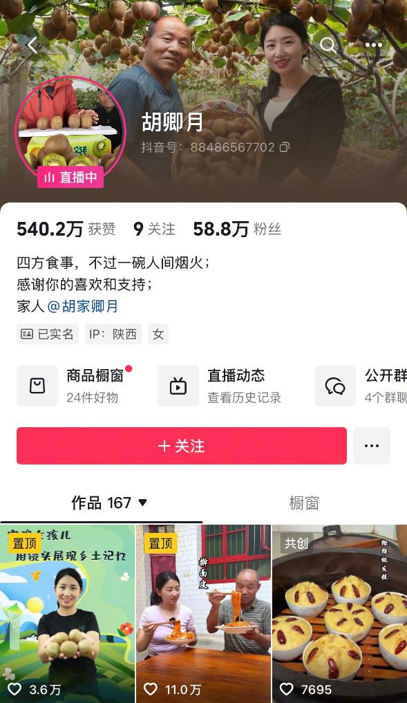 如今,这个“锵锵三人行”的团队,不仅以“胡卿月”之名向世界各地销售猕猴桃等优质农产品,更将凤翔泥塑、马勺脸谱等关中手工制品及其背后代表的陕西农村文化。“推介农村美食、展现农村生活、记录人间烟火,现在已经成为我们生活的全部。”胡泽果说。
