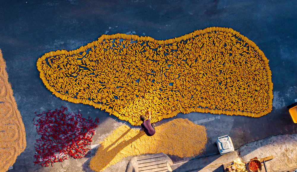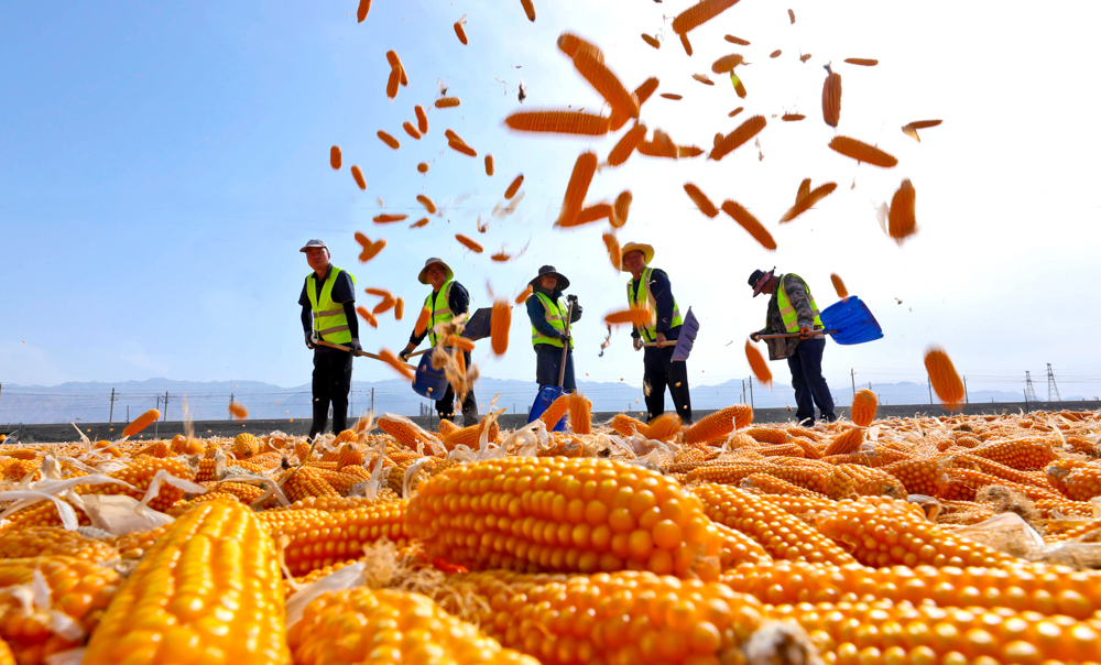 ↑2025年9月11日,工人在甘肃省张掖市高台县南华工业园区翻晒制种玉米。(无人机照片)CICPHOTO/王将 摄