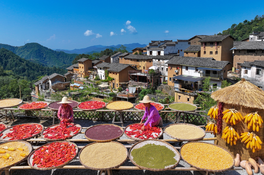 ↑2025年9月17日,农民在安徽省黄山市歙县深渡镇阳产村晾晒稻谷、玉米、南瓜、红辣椒等农作物。CICPHOTO/施亚磊 摄