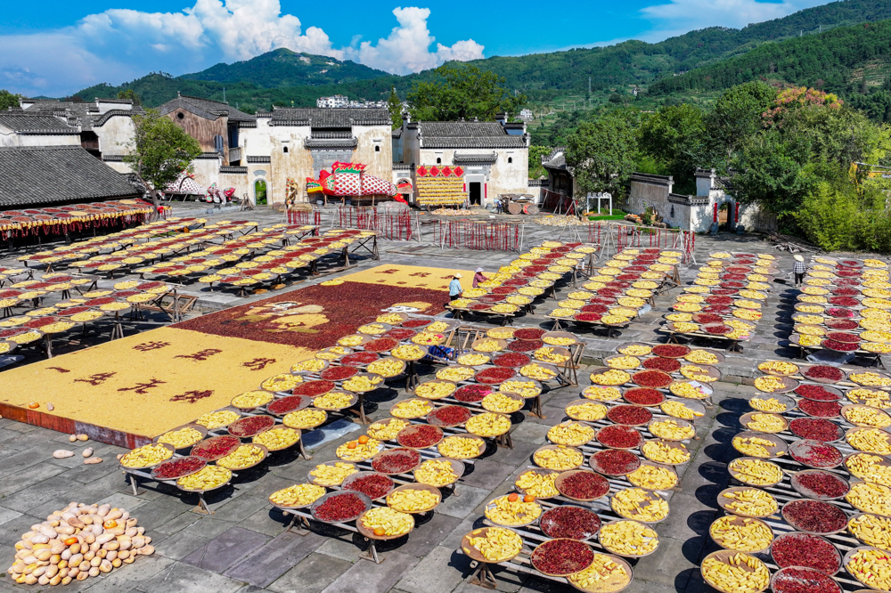 ↑2025年9月15日,农民在安徽省黄山市徽州区呈坎村晾晒稻谷、玉米、南瓜、红辣椒、笋干等农作物。(无人机照片)CICPHOTO/潘祯祥 摄